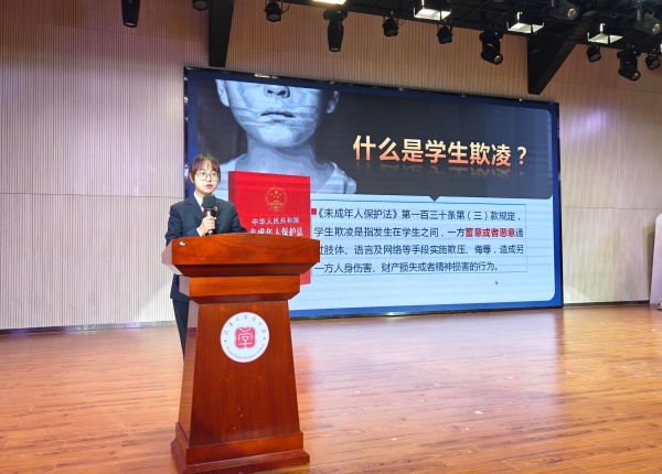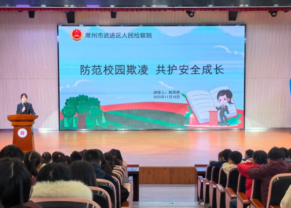 2025年11月18日下午,常州市武进区人民检察院韩雨桥检察官走进校园,开展“防范校园欺凌 共护安全成长”主题讲座。围绕“何为欺凌”与“如何应对”两大核心,韩检察官以案释法、破题支招,为同学们的成长注入法治力量,铸就自我保护的精神铠甲。