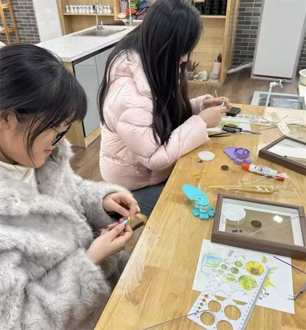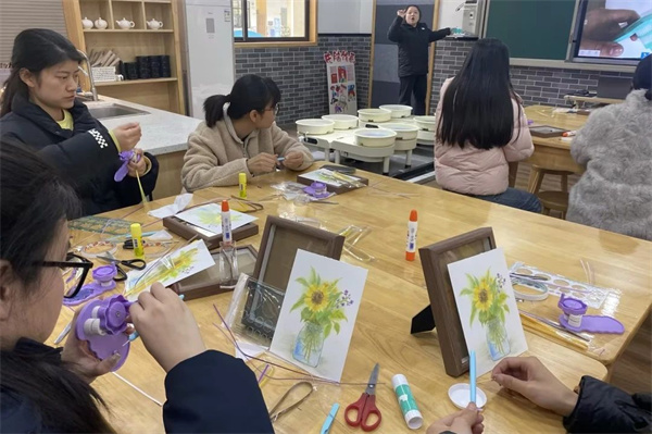 在衍纸工作坊里,桌上摆放着五彩斑斓的纸条、精致的卷笔、小巧的镊子等工具。专业老师耐心地讲解着衍纸的技巧,从基础的卷曲、弯曲到复杂的造型组合,每一步都蕴含着无限的创意与耐心。女教师们聚精会神地聆听,随后便沉浸在创作的海洋中。她们用灵巧的双手,将纸条卷起、捏紧、拼贴,纸条在她们的指尖跳跃,化作一朵朵娇艳欲滴的花朵、一幅幅精美的图案。这些作品仿佛诉说着女教师们内心的温柔与细腻,她们在创作中释放压力,享受着艺术带来的纯粹快乐,校园里弥漫着欢声笑语与创意的火花。
