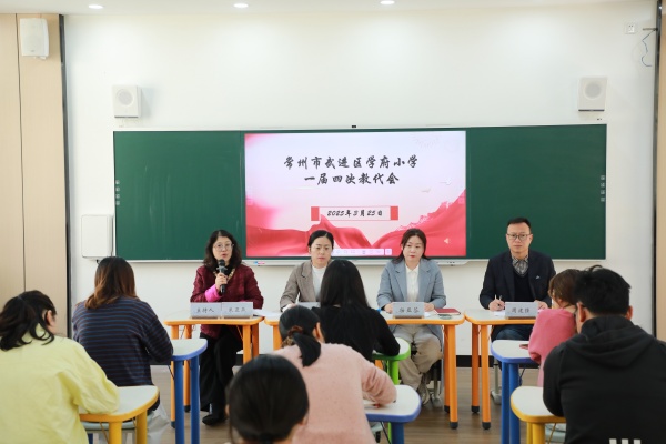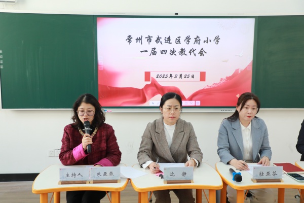 2025年3月25日上午,常州市武进区学府小学召开工会一届四次教代会。全体教代会代表参加会议,会议由朱亚燕副校长主持。