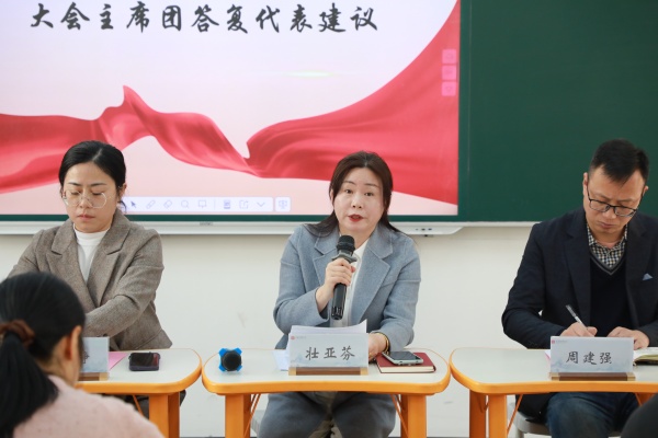 讨论结束后,党支部书记壮亚芬同志对代表们提出的相关问题进行了解释和答复。随后,代表们对会议中讨论的报告进行了举手表决,经过代表们的认真讨论和审议,代表们一致认为,这份报告有高度、有力度、有深度、有温度,随后与会的代表们举手表决,一致通过了此次审议内容,由周建强副校长宣读此次教代会决议。