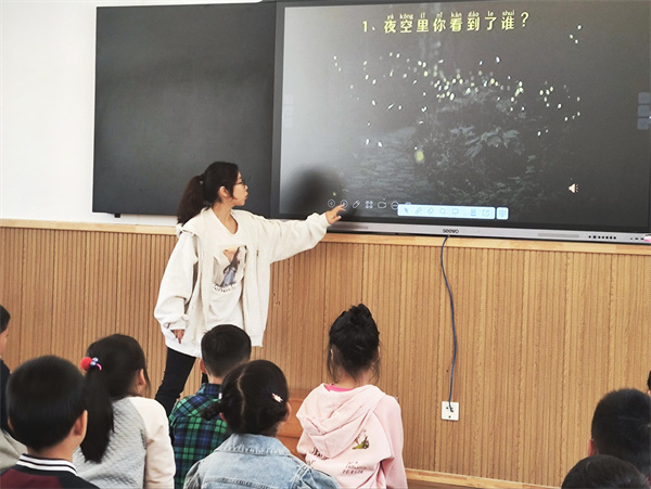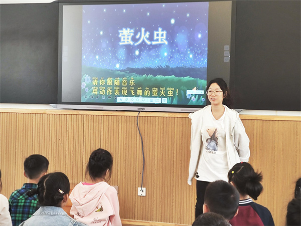 杨雪珂老师执教的是一年级教材《萤火虫》。教师根据歌曲特点,呈现出一次独具特色,精彩纷呈的教学活动。杨老师声情并茂地导入新课,通过歌曲《闪烁的星》带动孩子的兴趣,有效利用多媒体教学,通过欣赏夜晚的萤火虫,点燃孩子的学习激情。课堂中利用音符图标帮助小朋友更好的熟悉歌谱旋律,多用声势律动以及课堂小乐器的表演方式,丰富音乐课堂,调动学生学习的兴趣,让学生在有趣的音乐课堂中能够完整演唱《萤火虫》这首歌。