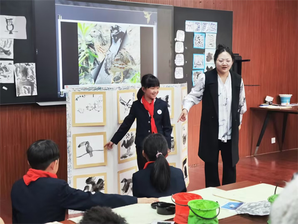 本次活动有三部分组成,分别是李老师执教《点线面》,王老师执教《水墨画鸟》,组织大家学习《常州市全面实施学校美育浸润行动工作方案》,提出可行策略和方案。《点线面》是低年级的课程。李老师充分渗透中西方画家的表现方法,让学生在轻松愉悦的情境中掌握点线面的变化。学生在玩中学,体会无限快乐。学府小学王老师执教的《水墨画鸟》来源于苏少版四年级教材。本课的教学容量大,知识点多。老师通过示范、探究、欣赏、讨论、分析、尝试等教学环节,引导学生感知水墨语言的丰富表现力,体验水墨表现的意趣。