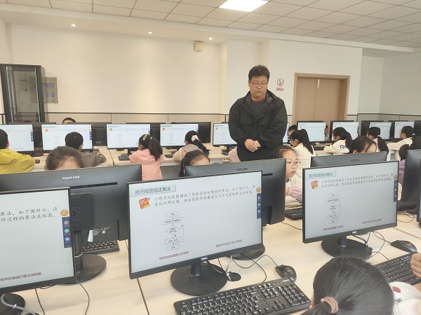 随后,孙烨老师在四楼机房呈现了信息科技示范课《用流程图描述算法》。课程紧密围绕核心素养目标,以生活实例为切入点,通过对比自然语言与流程图的描述差异,帮助学生理解流程图的核心价值。课堂中,孙老师系统讲解了流程图的基本符号与规范,通过智能音箱唤醒、声控楼道灯工作等生活化场景,引导学生动手绘制流程图,将抽象的算法知识转化为直观的实践操作。小组合作与分层挑战的教学设计,充分调动了学生的参与热情,数字化工具的实时反馈让算法思维可视化,完美诠释了"做中学"的学科特色。
