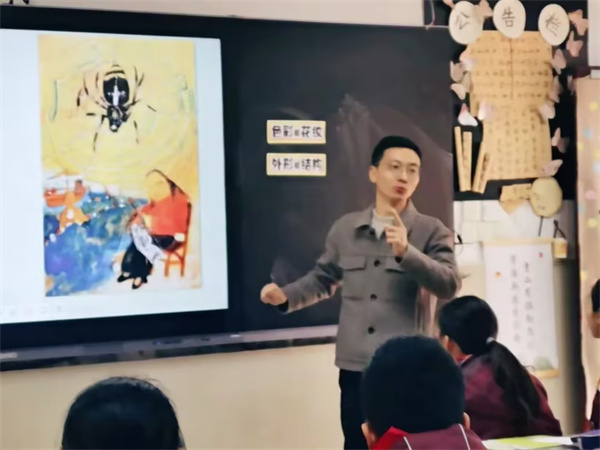 随后,白文俊老师引领示范了《像动物朋友学习》一课,本课是一节“造型·表现”领域的美术课,在小学阶段学习了各种动物之后,从另一个角度描绘了动物不为人知的各个侧面。在白老师的课堂中,他将仿生学这一知识点,通过有趣的游戏,丰富的影像,不断启发学生,引导学生想象、设计、表现。课堂中他能够始终围绕学生进行评价,师生互评,学生互评,学生自评相结合。在轻松的课堂氛围中同学们欣赏自己的作品,评说其中的优点,找出其中的不足。整节课体现出教学评一体化。