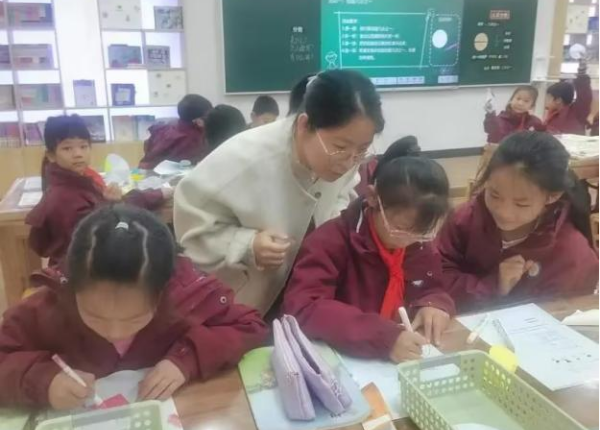 课堂是教育的主阵地,也是蒋敏老师播撒初心的田野。班级的孩子天性活泼如林间雀,课堂常规管理如同“牵着一群小云朵前行”,需要格外用心。面对挑战,她立下“严”的标尺:课前,数学课本、练习本、文具要像“小士兵”般列队整齐;课上,发言先举手、倾听要专注,每一项规矩都清晰如晨光。遇上走神的小脑袋、交头接耳的小嘀咕,她从不大声呵斥,而是用眼神示意、轻声提醒,像春风拂过麦田,悄悄帮孩子们扶正成长的方向。
