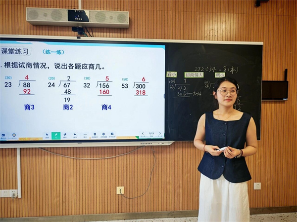随后,戚老师创设了“班级借书”的真实情境,让学生在现实问题中提取数学信息。在实际计算过程中,学生发现“商与除数的乘积大于被除数”,从而引发认知冲突——这也正是本节课要解决的核心问题。通过小组合作学习,学生逐步理解并掌握了“四舍调商”的方法。在这一过程中,戚老师并未直接给出答案,而是鼓励学生自主探索、发现规律,充分体现了以学生为主体的教学理念。