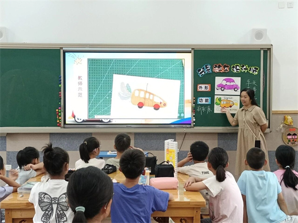 殷红霞老师的《我是汽车设计师》课堂,以一则妙趣横生的谜语、一段鲜活的《汽车总动员》视频拉开序幕,瞬间将学生带入奇妙的汽车世界。新授环节如剥茧抽丝,从汽车百年发展史的追溯,到车身外形与核心功能的细致拆解,层层深入,让知识自然流淌。当她亲手示范的 “水陆两栖车” 亮相时,独特的创意引来学生阵阵惊叹;随后的 “组装汽车” 小游戏,更像一把火种,点燃了全场的创作热情。在作业展示与实践创作中,孩子们或交流想法,或伏案勾勒,既读懂了设计的逻辑,更挥洒了艺术的灵感,创意的萌芽在欢声笑语中悄然生长。