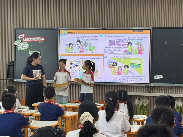 第一节课由殷华怡老师执教五(上)Unit 2《A new student》Story Time。殷老师以“校园布局”为情境主线,通过“Predict—Read—Role play”三轮阅读,层层递进,把文本中的方位介词、重点句型“Is there…?”“There is/are…”自然嵌入任务。