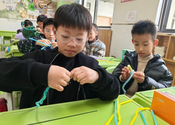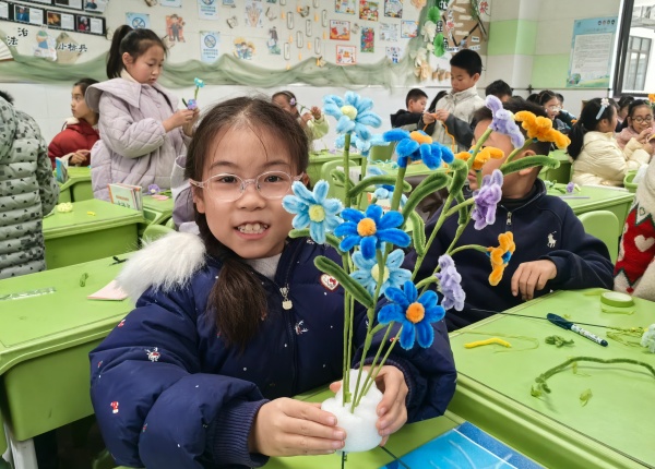 12月12日,三(1)班的教室里充满创意与色彩。印晨泽妈妈走进课堂,带来了一堂生动有趣的“扭扭棒编制花朵”手工课。她耐心地向孩子们展示了如何通过:扭转、缠绕、组合等方式,将一根根普通的扭扭棒,变成一朵朵栩栩如生的小花。