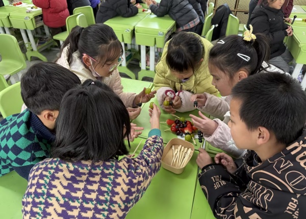 动手制作:指尖上的甜蜜协作。讲解结束后,激动人心的制作环节正式开始。孩子们分成七小组,在家长和老师的指导下,有条不紊地操作起来。用竹签将处理好的水果串成串,有的孩子串得整整齐齐,有的则创意十足地搭配了不同颜色的水果,变成了彩色的“小灯笼”。