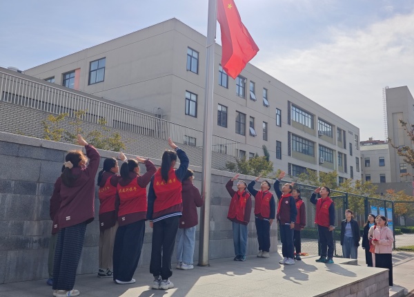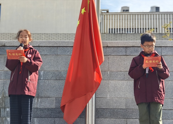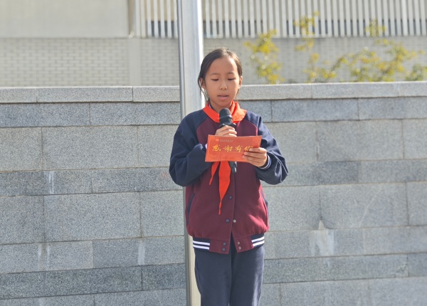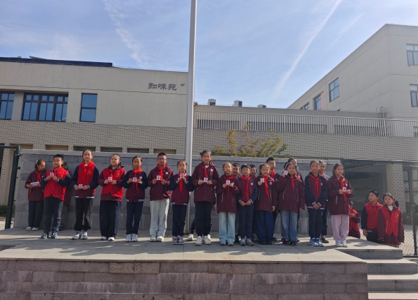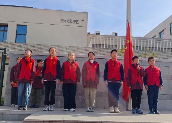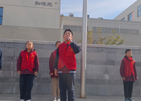 “全体立正!升国旗,高唱国歌,全体少先队员行队礼,全体脱帽!”主持人的指令清晰有力。五班孙一诺与朗诵社团代表组成的升旗手队伍,动作标准地将国旗固定在旗杆上。