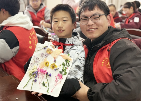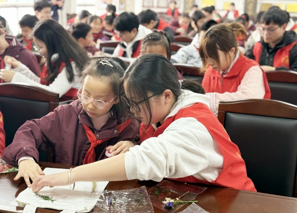 故事分享会结束后,志愿者们带领学府小学的孩子们开启了创意手工与主题绘画环节。本次活动特别设计了干花DIY帆布包制作,将艺术创作与雷锋精神传承巧妙融合。孩子们在大学生志愿者的指导下,精心挑选干花材料,认真构思图案布局,将一朵朵干花粘贴在帆布包上,制作出独一无二的“雷锋主题”环保帆布包。