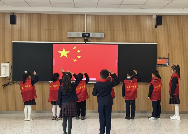 随后,合唱社团的优秀学生代表依次上台作自我介绍,他们表达了热爱祖国、尊敬国旗的真挚情感,并表示要在班级里团结同学、努力学习,在合唱团认真歌唱、全面发展,争做优秀小学生。在雄壮的国歌声中,五星红旗冉冉升起,全体师生肃立行礼,高唱国歌,表达对祖国的无限热爱。
